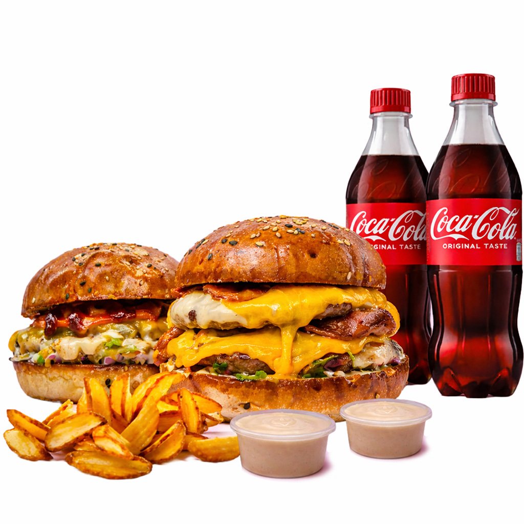 Royal Chesee - Double & Royal Chesee - Single; 2x Bulka grilovaná na másle, 3 x hovězí maso(100g), čedar, sýr montana, rajče, salát, cibule, omáčky ; 2x Bramborové Hranolky; 2x Medová Majonéza a 2x Nápoj zdarma dle výběru.