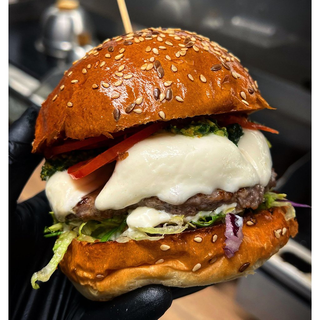 Bulka grilovaná na másle, mleté hovězí maso(100g), čerstvý kozí sýr, rajče, cibule, salát, omáčky (bbq, medová majonéza a hořčičný dip)
