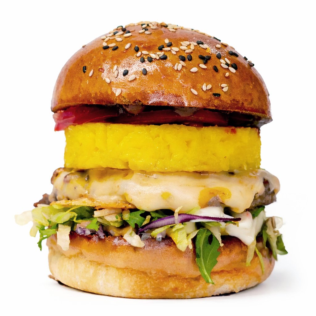 Bulka grilovaná na másle. Hovězí maso(100g), ANANAS, čedar, sýr montana, rajče, salát, cibule, omáčky (bbq, medová majonéza a hořčičný dip).
