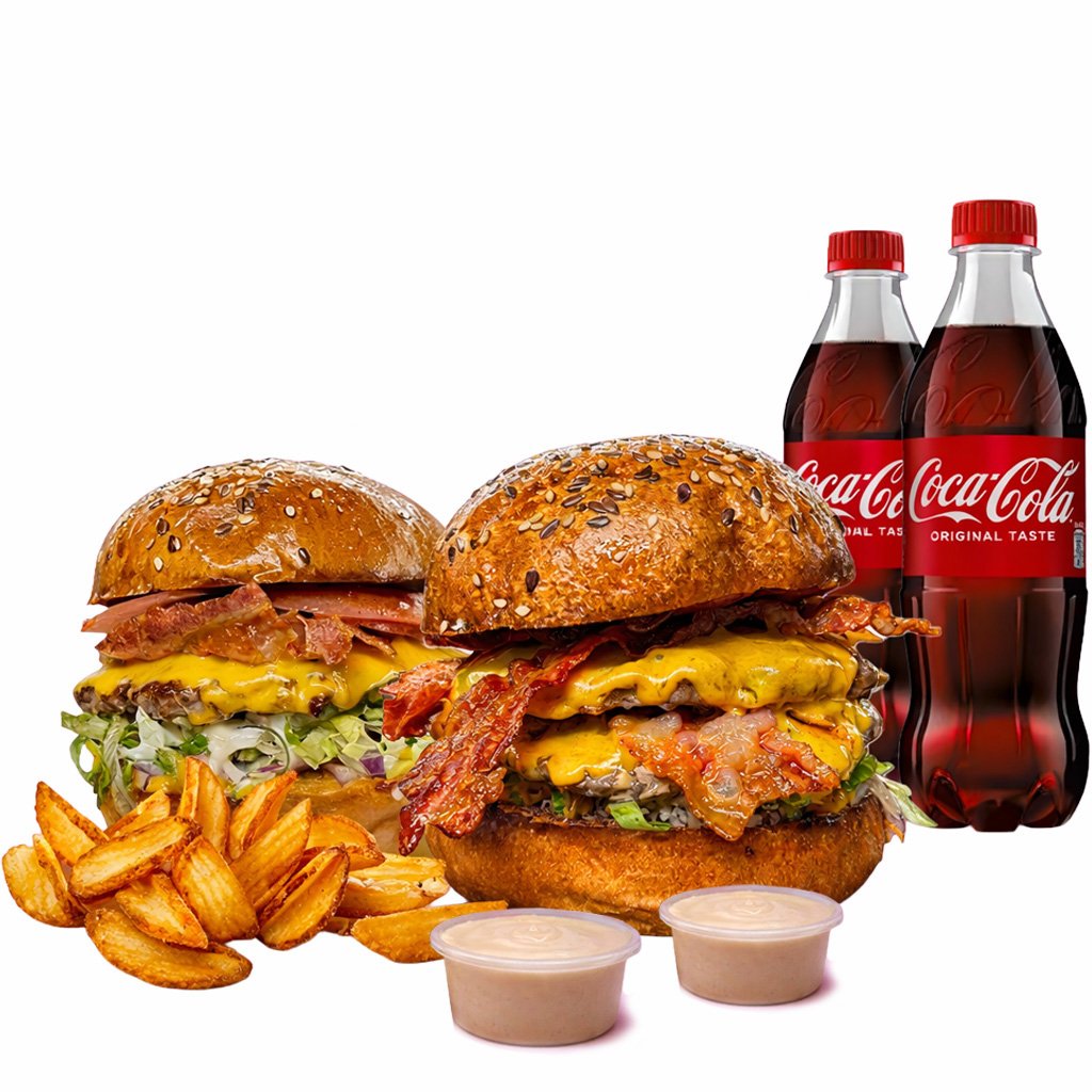 Nitro-Double& Nitro-Single; 2x Bulka grilovaná na másle, 3x mleté hovězí(100g), slanina, čedar, rajčátka, salát, cibule,; 2x Bramborové Hranolky; 2x Medová Majonéza a 2x Nápoj zdarma dle výběru. U výhodných menu není možné dělat úpravy složení.
