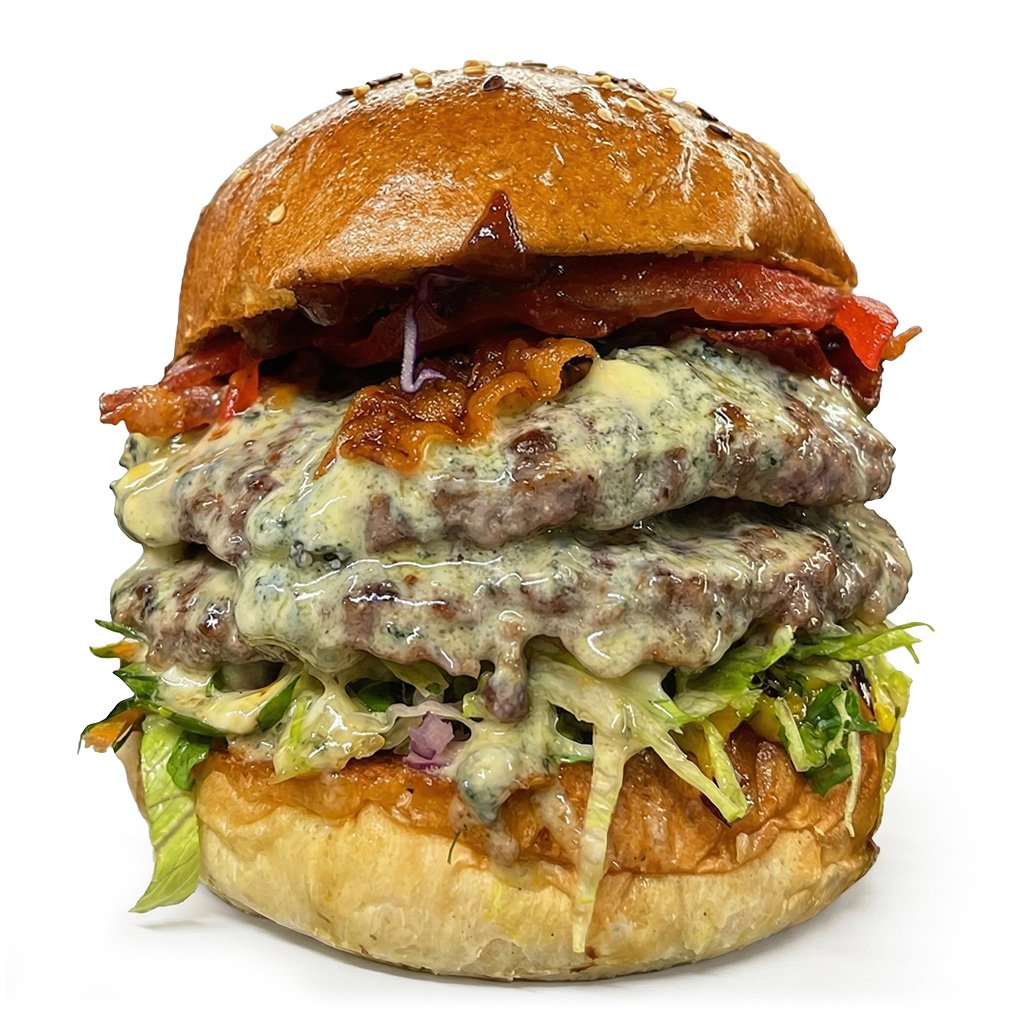 Bulka grilovaná na másle, 2x mleté hovězí(100g), anglický sýr s modrou plísní Blue Clawson Stilton, slanina, rajče, cibule, salát, omáčky (bbq, medová majonéza a hořčičný dip)