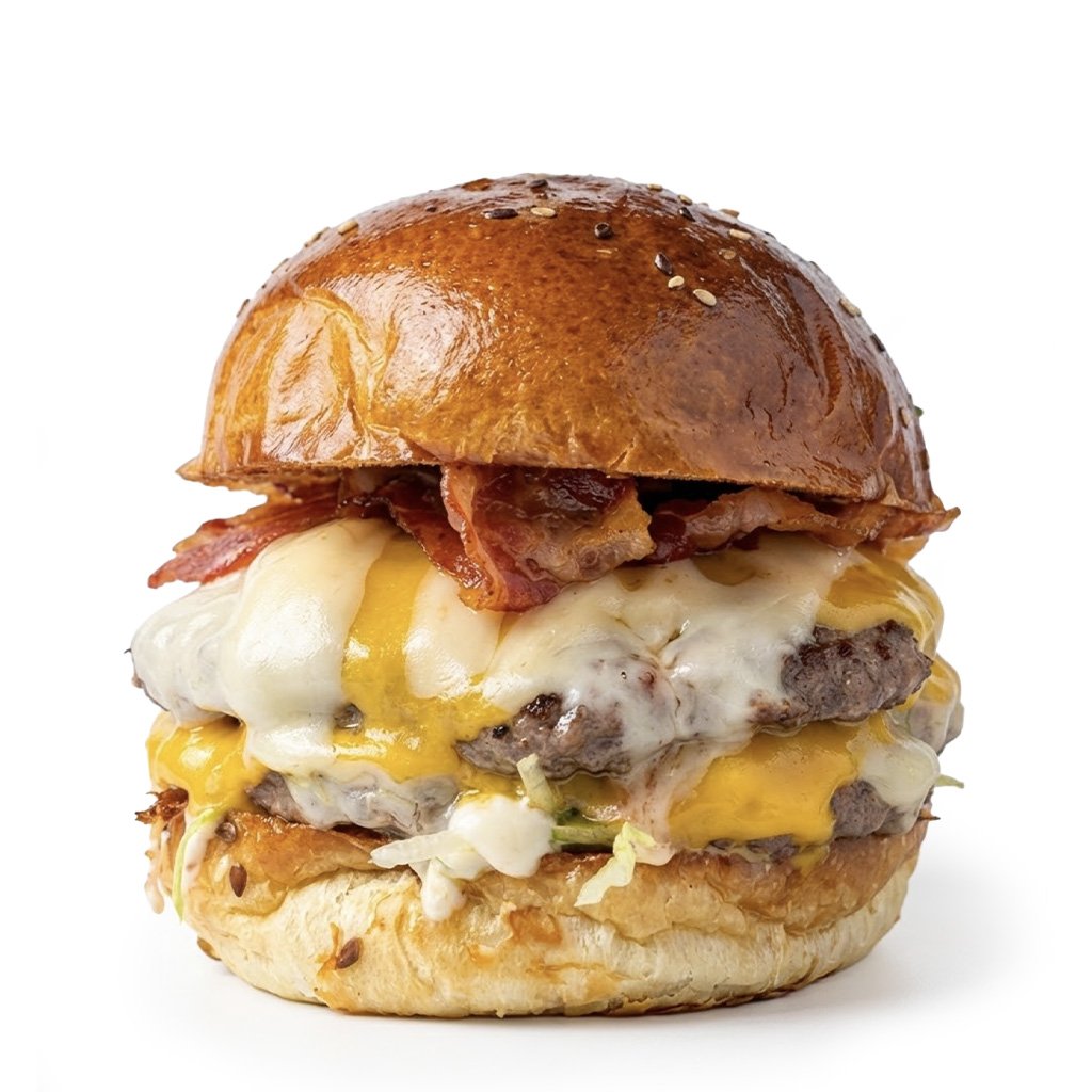 Bulka grilovaná na másle. 2x hovězí maso(100g), slanina, extra porce čedaru a sýru montany, trocha salátu, omáčky (bbq, medová majonéza a hořčičný dip).