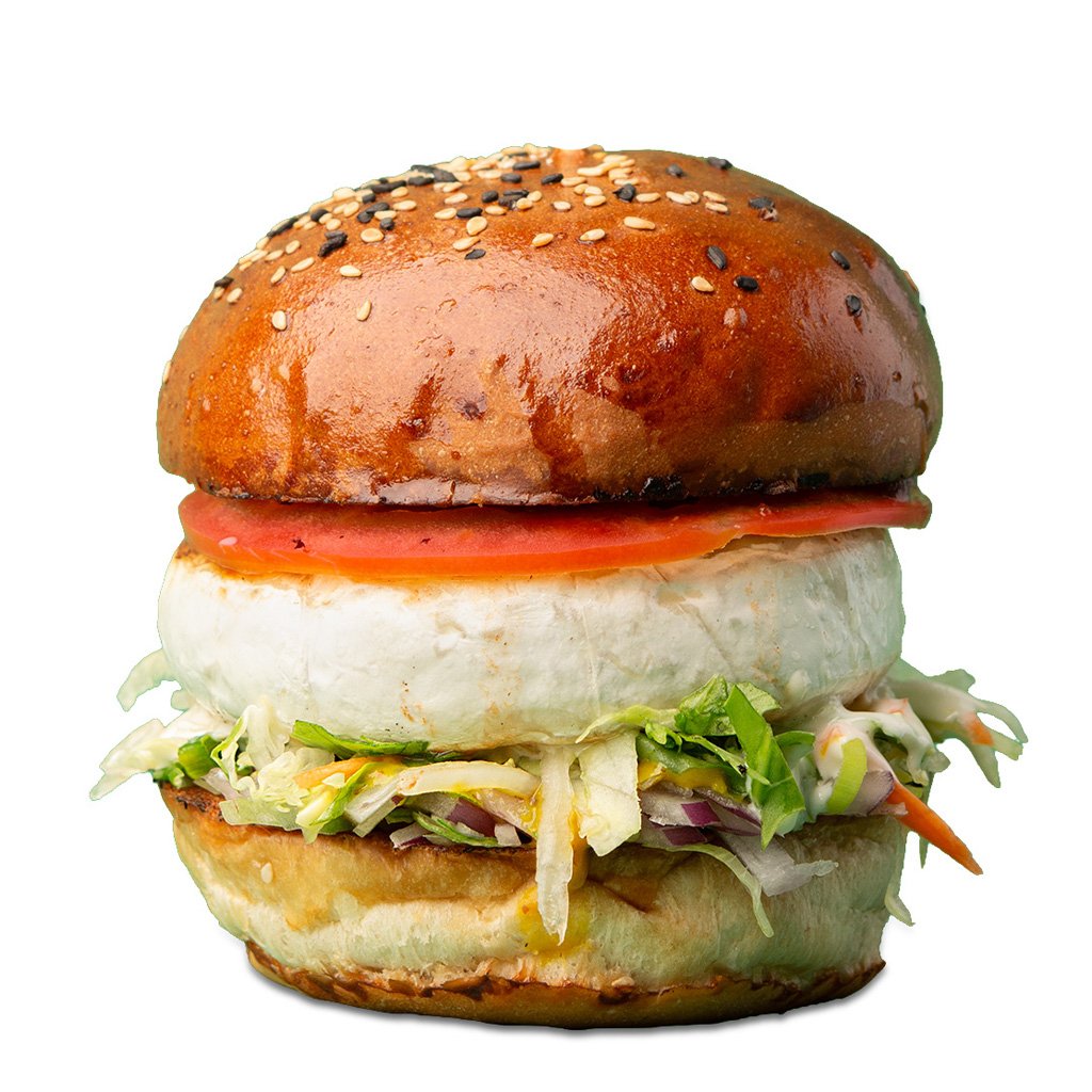Bulka grilovaná na másle. Hermelín(120g), rajčátka, salát, cibule, omáčky (bbq, medová majonéza a hořčičný dip).