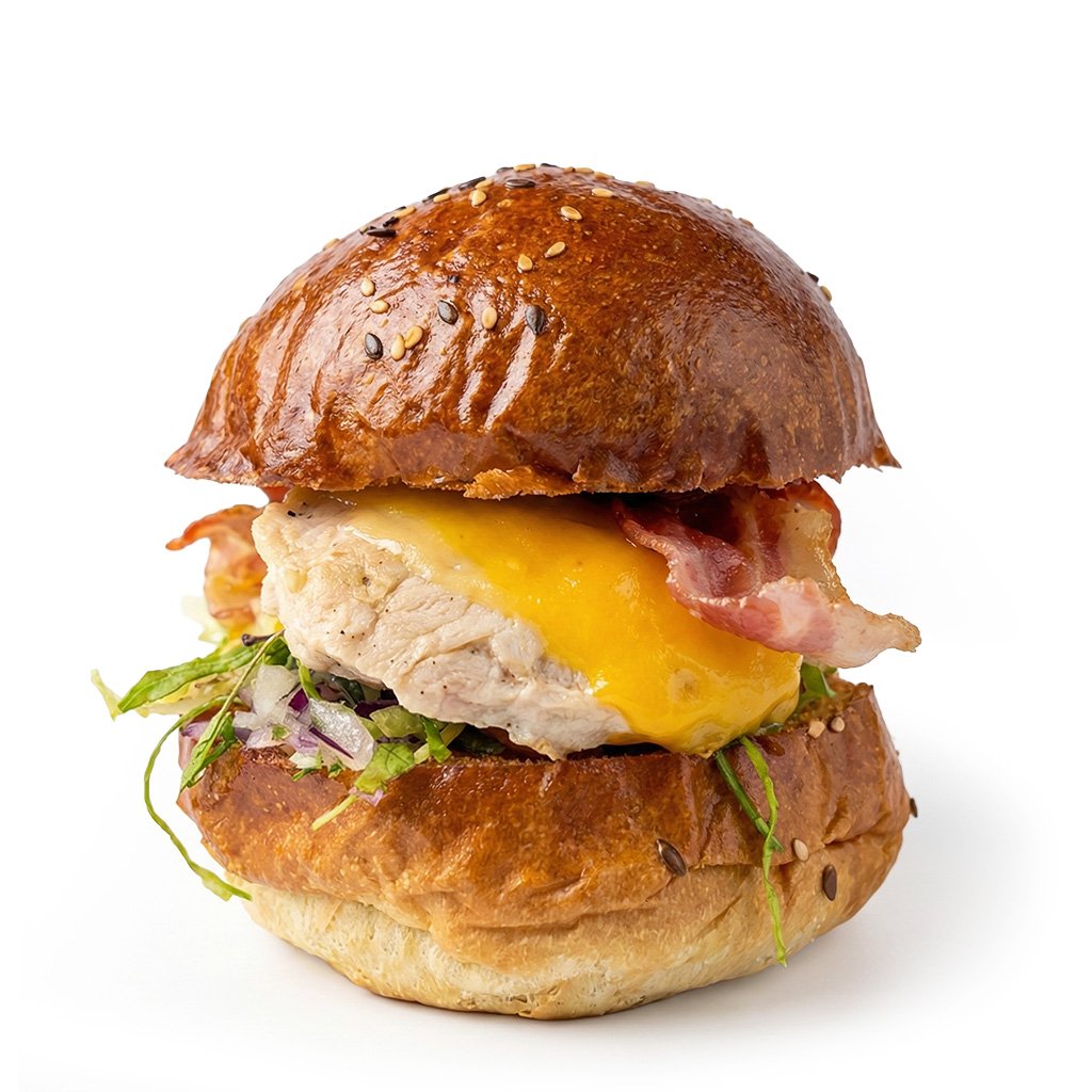 Bulka grilovaná na másle, porce sous-vide krůtí prso, slanina, čedar, ementál, rajčátka, salát, cibule, omáčky (bbq, medová majonéza a hořčičný dip).