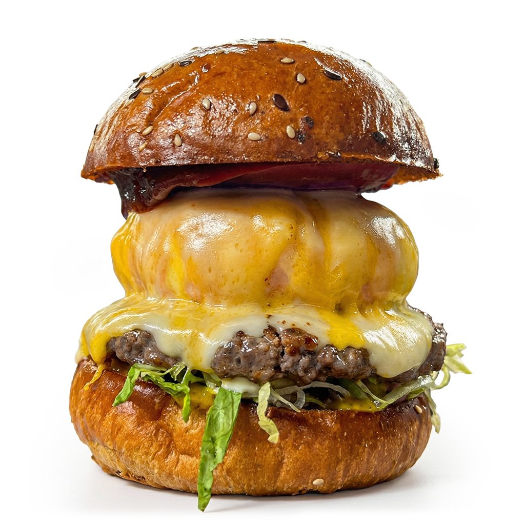 Bulka grilovaná na másle. Mleté hovězí(100g), hermelín, slanina, čedar, sýr montana, rajčátka, salát, cibule, omáčky (bbq, medová majonéza a hořčičný dip).