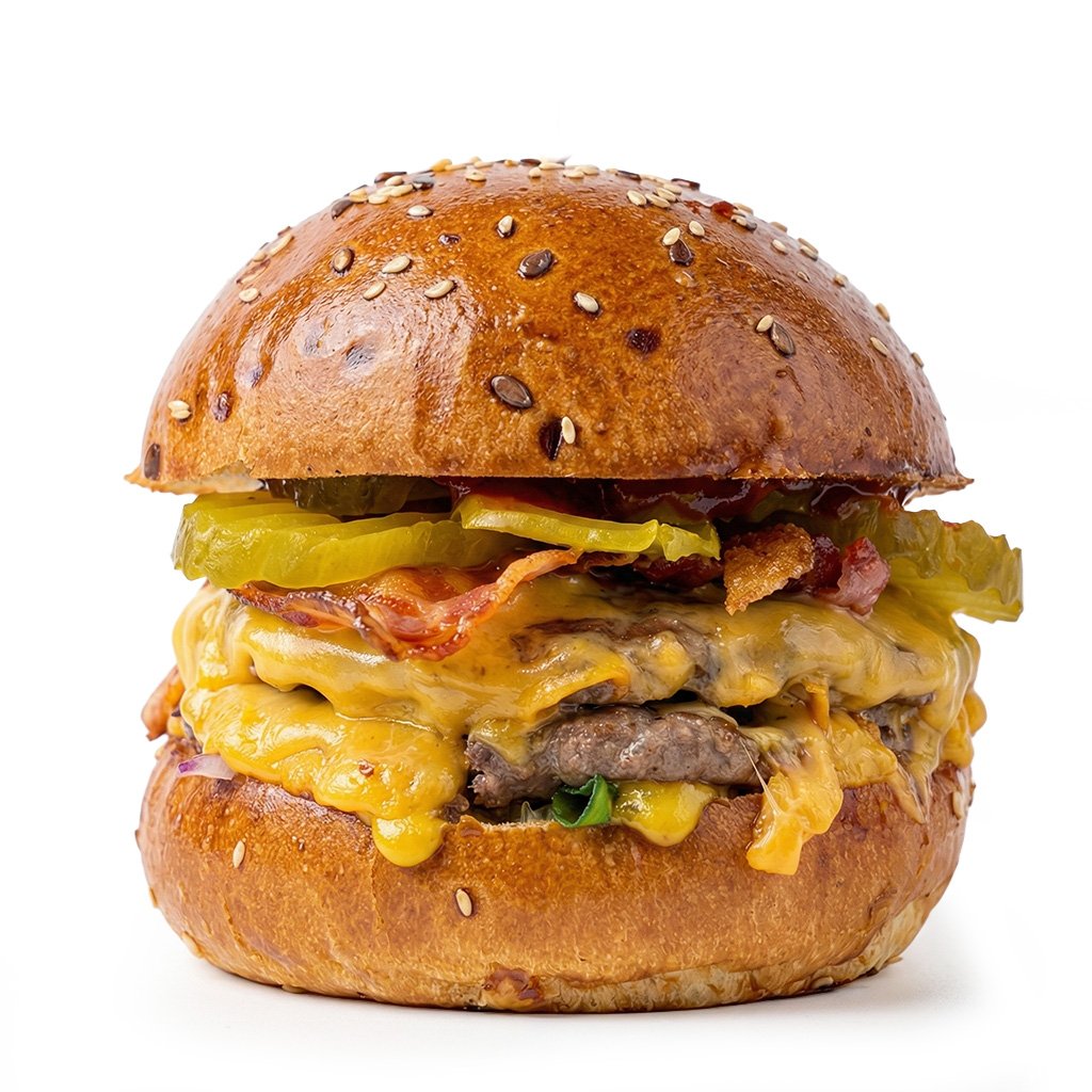 Bulka grilovaná na másle, 2x mleté hovězí(100g), slanina, čedar, cibule, americké okurky, omáčky (bbq a hořčičný dip).